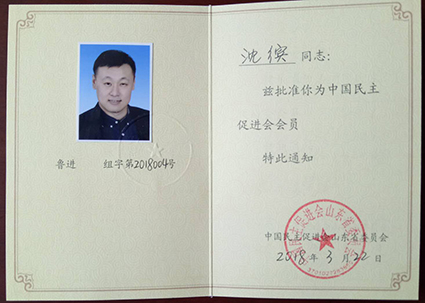 公司董事長沈繽同志于20181申請(qǐng)加入中國民主促進(jìn)會(huì),3月份中國民主促進(jìn)會(huì)山東省委員會(huì)正式批準(zhǔn)沈繽同志加入中國民主促進(jìn)會(huì)。