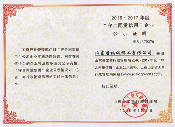 熱烈祝賀山東省機(jī)械施工有限公司,連續(xù)27年獲得“山東省省級(jí)守合同重信用企業(yè)”稱號(hào)!