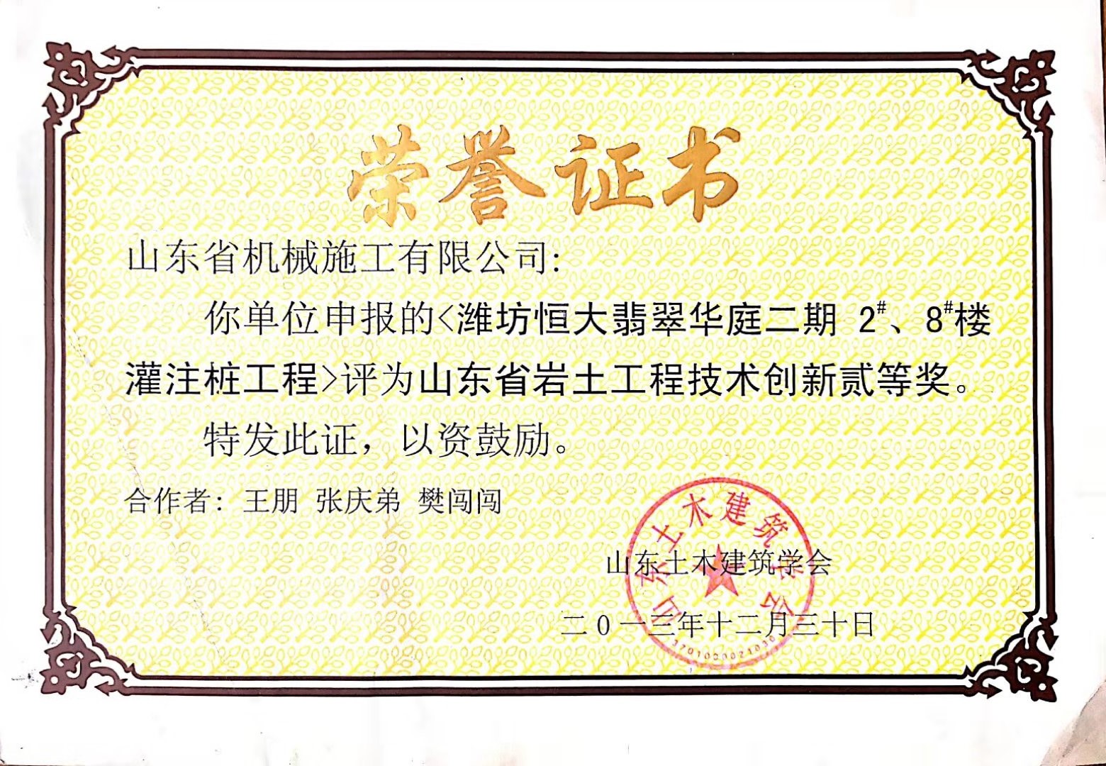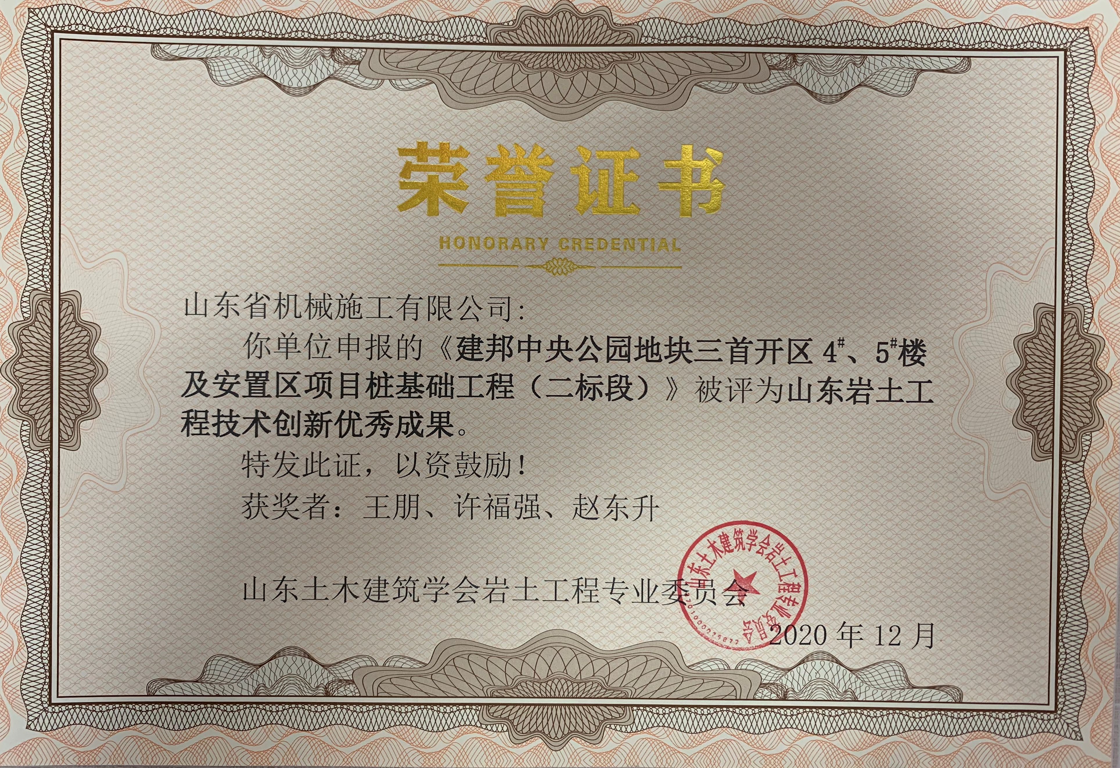 在王朋同志參與的眾多工程中,其中,菏澤恒大陽光半島項(xiàng)目樁基工程,完成產(chǎn)值約2430萬元;濟(jì)南平安金融中心樁基工程,完成產(chǎn)值約1500萬元,并榮獲山東巖土工程技術(shù)創(chuàng)新特等獎;菏澤建邦中央公園樁基工程,完成產(chǎn)值約900萬元,并榮獲山東巖土工程技術(shù)創(chuàng)新優(yōu)秀成果;山東晉煤明化潔凈煤氣化項(xiàng)目管樁工程,完成產(chǎn)值735萬元;魯能領(lǐng)秀城抗浮錨桿工程,完成產(chǎn)值約800萬元。綠地泉景隆悅公館榮獲山東省深基礎(chǔ)優(yōu)秀工程一等獎;濰坊恒大名都工程榮獲山東省深基礎(chǔ)優(yōu)秀工程二等獎;濟(jì)南銀豐玖璽城項(xiàng)目、山東晉煤明化樁基工程、濰坊翡翠華庭灌注樁工程等多個項(xiàng)目被評為“山東巖土工程技術(shù)創(chuàng)新”二等獎,參與編寫了“超大直徑嵌巖灌注樁多次成孔擴(kuò)孔”施工工法,為公司創(chuàng)造了良好的經(jīng)濟(jì)效益和社會效益,贏得了建設(shè)單位和公司領(lǐng)導(dǎo)的稱贊。